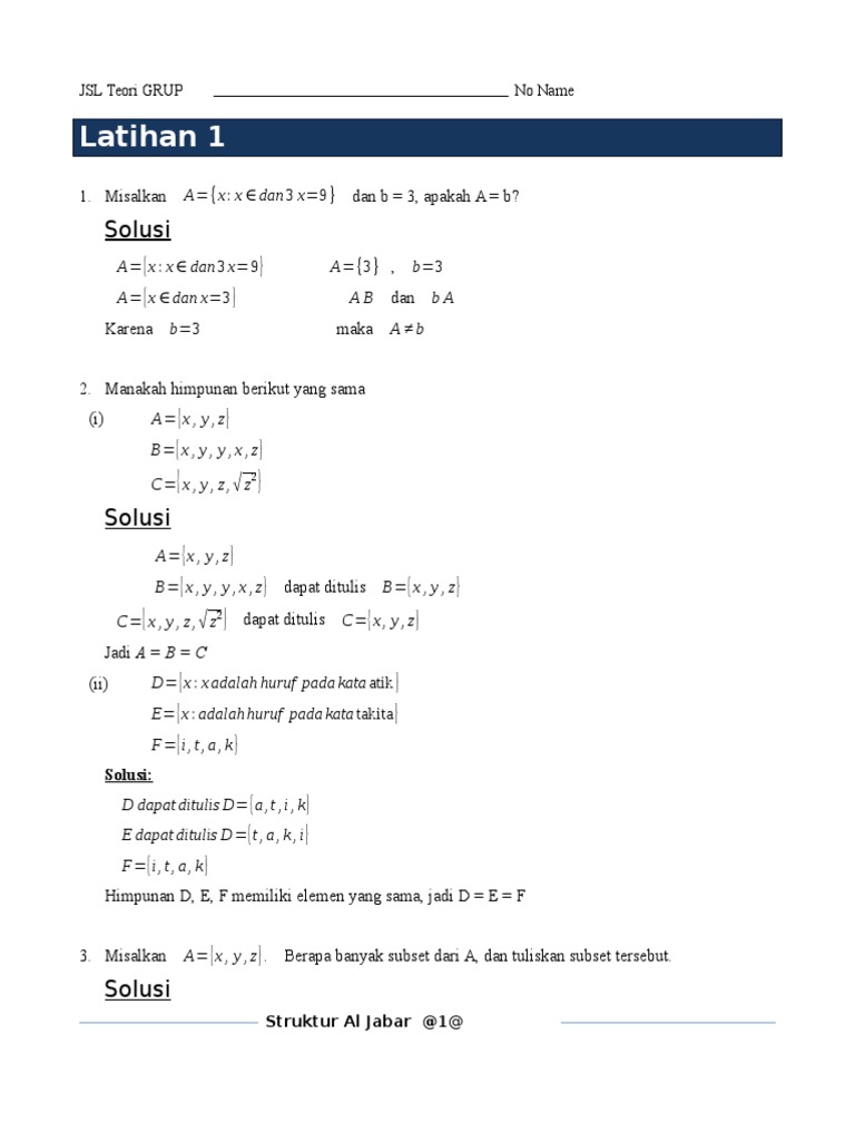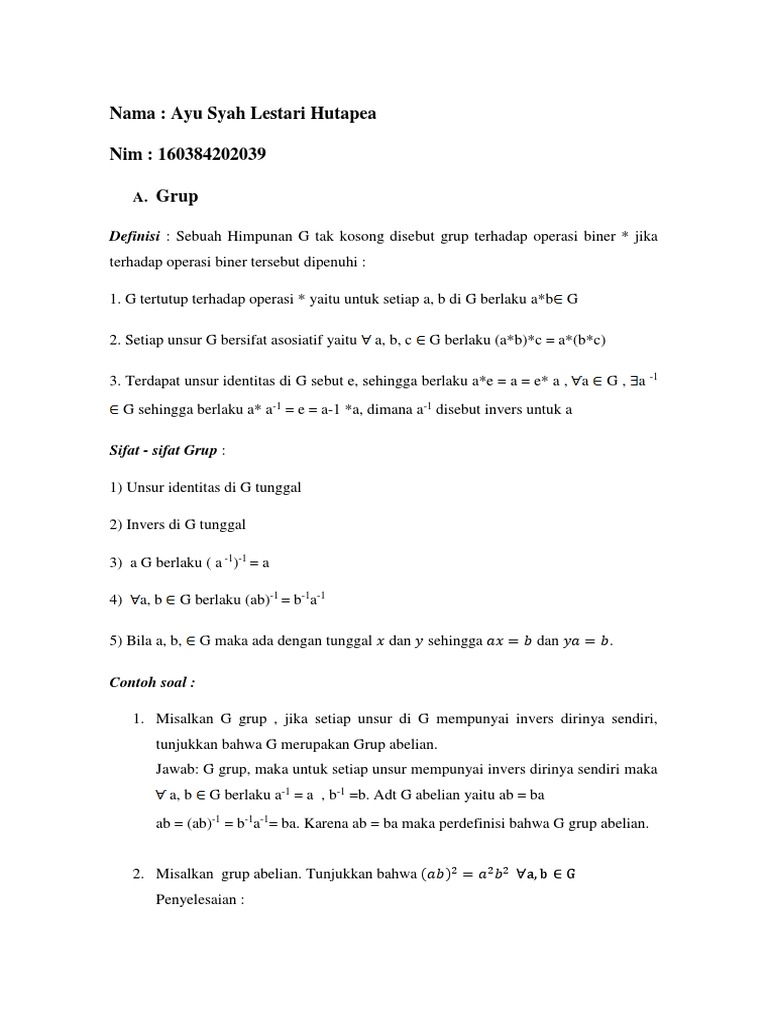 Sebuah himpunan g dengan operator * disebut 'grup' jika: Selamat pagi, kali ini gue mau coba berbagi 2 contoh soal tentang mengecek apakah suatu himpunan tertentu dengan operasi tertentu adalah grup atau bukan. 32 contoh soal struktur aljabar ring dan penyelesaiannya. Tunjukan bahwa dengan operasi penjumlahan dan perkalian pada himpunan bilangan bulat, p membentuk ring komutatif. Where to download contoh soal integral tak tentu dan penyelesaiannya contoh soal integral tak tentu dan penyelesaiannya thank you for downloading contoh soal integral tak tentu dan penyelesaiannya.maybe you have knowledge that, people have look numerous times for their favorite novels like this contoh soal integral tak tentu dan penyelesaiannya, but end up in. Dua di antaranya adalah dan. Subgrup dari grup ( r, +) antara lain: Jawaban a) ambil sembarang x, y ∈ g sehingga muncul pemetaan. Grup matriks 2×2 bilangan riil dengan determinan = 1, dengan operasi perkalian matriks adalah subgrup normal dari grup matriks 2×2 bilangan riil dengan.