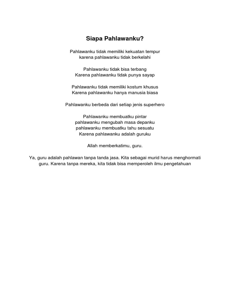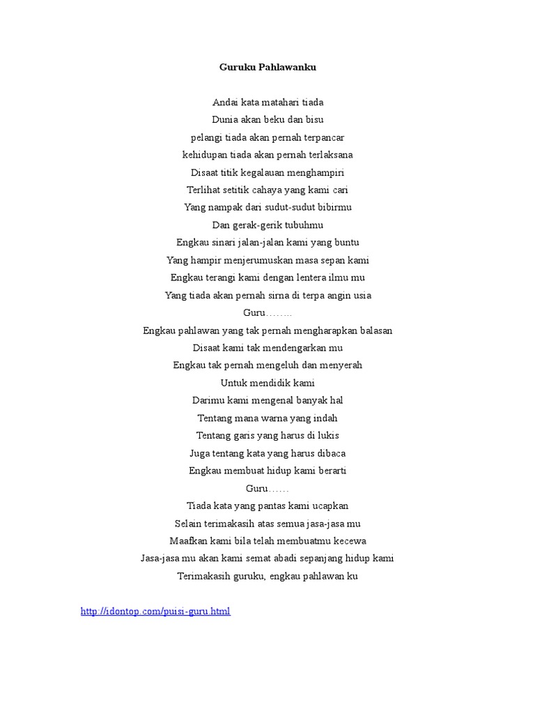 Guruku terimakasih ku ucap padamu doa ku panjat untukmu harap kau sehat selalu. Dia pahlawan yang tak kenal kata lelah. Dia kan sedih kala murid tertinggal ilmu Kumpulan puisi terbaik 2017 tema kehidupan hilang kau pergi kesana pergi begitu saja tanpa mengucap sapa serta tak ada sapa kemana kau pergi kenapa kau berlari apakah kau kemba. Jika hari ini ada anak yang pintar, pandai, cerdas, dan berprestasi, maka itupun karena jasa guru. R.(7d) membacakan puisi bertemakan guruku pahlawanku yang mana puisi ini menjelaskan perjuangan guru di masa pande. Hari guru nasional diperingati setiap tahunnya pada tanggal 25 november, kini memperigati hari spesial bagi sosok berjasa di dunia pendidikan indonesia. Guruku kau pengantar asaku kau membagi ilmu pengetahuan kau memberi contoh teladan. Mengingat jasanya yg sangat besar terhadap kita semua, tentang kata kata guru inilah diceritakan puisi terima kasih untuk guru atau puisi tentang terima kasih guruku