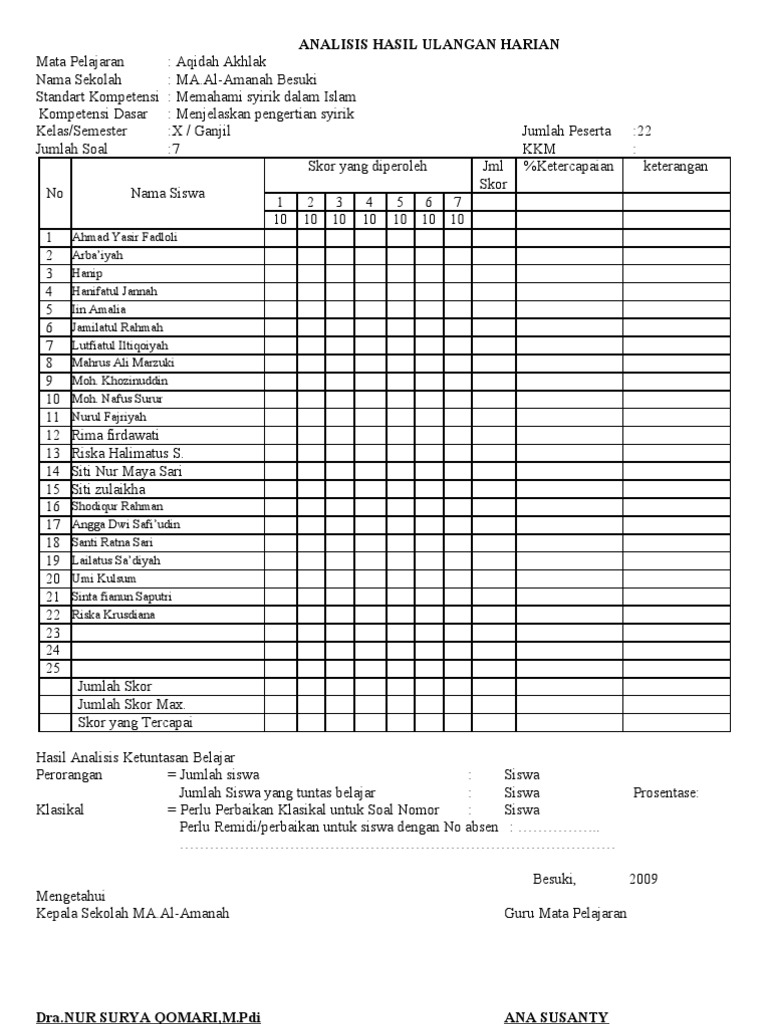 Format Ini Memuat Analisis Hasil Ulangan Harian Dan Program Perbaikan Bagi Siswa Yang Mencapai Nilai Di Bawah.