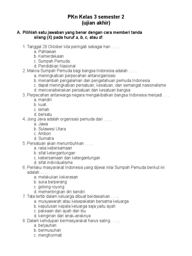 2 dollar essay is cheap essay writing service for students where rates for a college essay are as low as $2 per page only. Maaf karena soal terbatas hanya sampai kelas 5 sd saja, karena anak saya yang paling besar masih kelas 5 sd ((^_^))), tapi untuk kedepannya tidak menutup kemungkinan akan saya tambahkan untuk tingkat kelas berikutnya. Soal latihan uts pkn kelas 3 sd semester 2. Moto persatuan dalam keragaman diambil dari buku sutasoma, yang ditulis oleh. Oleh ppkn diposting pada 22 november 2021. Akses berbagai latihan, ulangan, dan ujian sekarang juga, gratis ! Manusia sebagai makhluk tuhan diberi kelebihan. Kunci jawaban soal uts pts pkn kelas 9 semester 2 bagian 2. Soal ini terdiri dari soal pilihan ganda dan soal isian.