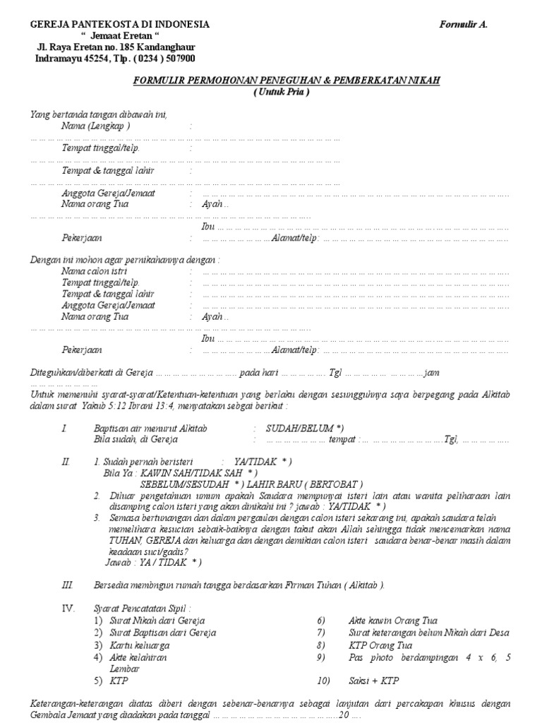 Form n4 =berisi keterangan tentang orang tua. Form n3 =berisi persetujuan kedua mempelai. Penggunaan blangko nikah (na form) untuk masing masing formulir tentunya berbebda. Sarang i plt kepala m. Surat pengantar nikah dari desa/kelurahan. Khusus di bali formulir ini bisa didapat di kua dan ada tambahan kolom pengesahan dari kepala lingkungan/kelian. Form n1 = surat keterangan untuk nikah. Lampiran vii keputusan direktur jenderal bimbingan masyarakat islam nomor 473 tahun 2020 tentang petunjuk teknis pelaksanaan pencatatan pernikahan Berikut beberapa formulir yang bisa kamu download:
