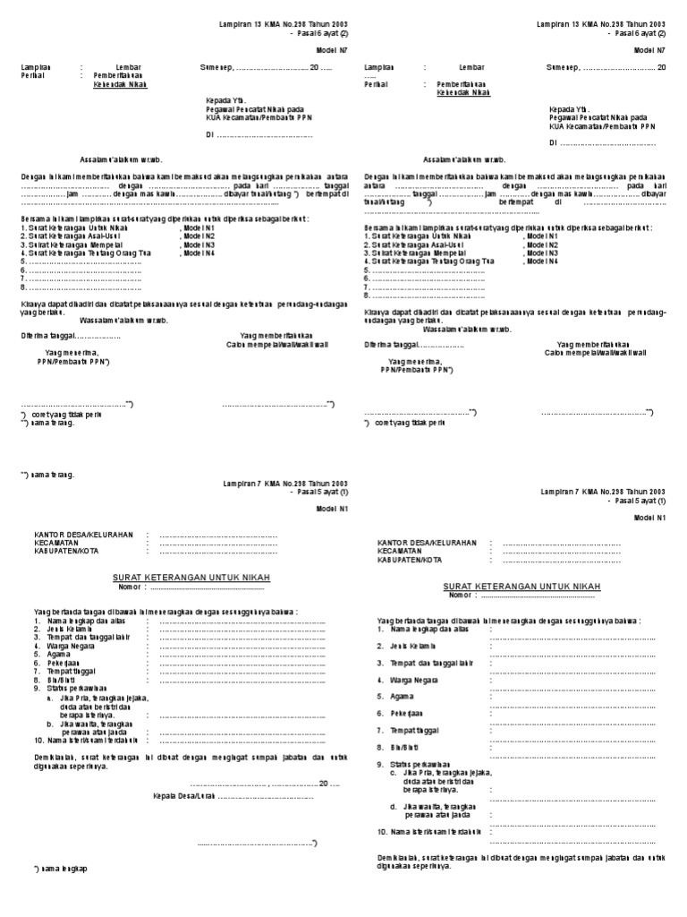 Pegawai kantor urusan agama kec. Model n2 (download doc) 03. Blanko untuk nikah (model n1, n2, n4 lengkap) lengkap dari desa dan kelurahan. Berikut formulir n1, n2, n3, n4 dan n6 sesuai lampiran keputusan dirjen bimas islam nomor 713 tahun 2018 yang bisa diunduh atau download dalam bentuk document ( doc ) yang bisa diedit dan dicetak dengan mudah. Formulir pengantar nikah model n1 kantor desa/kelurahan : Formulir permohonan penerbitan akta kelahiran terlambat.doc: Model n1 (download doc) 02. Sptjm kelahiran anak di luar nikah.doc: Surat pernyataan tidak dipungut biaya dan tidak melalui calo (skpwni).docx: