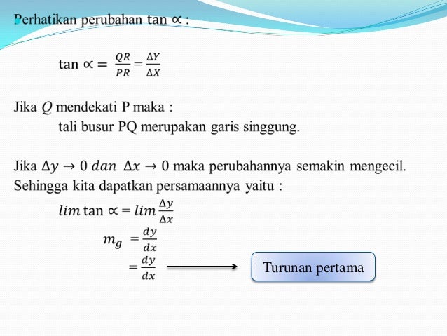 Tentukan turunan pertama fungsi berikut ini: • sebagai penunjang untuk penyelesaian persamaan. Menggunakan definisi limit untuk menghitung turunan, atau untuk memastikan turunan tidak ada menghitung turunan (tanpa bantuan tik). View turunan.ppt from mat misc at padang state university. Turunan fungsi aljabar hasil bagi, dengan syarat v(x) ≠ 0 8. Tujuan instruksional khusus mahasiswa mampu: Arial calibri constantia wingdings 2 symbol century schoolbook wingdings tahoma times new roman flow 1_flow 2_flow 3_flow mathtype 6.0 equation microsoft equation 3.0 aplikasi turunan slide 2 slide 3 slide 4 maksimum dan minimum slide 6 teorema titik kritis slide 8 slide 9 slide 10 slide 11 slide 12 slide 13 slide 14 fungsi menaik dan menurun. Penggunaan turunan fungsi trigonometri xii mipa 3 syarat • nilai stasioner apabila f’(x)=0 • fungsi naik apabila f’(x)>0 • fungsi turun apabila f’(x)0 • nilai maksimum saat stasionernya paling tinggi (titik puncak) • nilai minimum saat stasionernya paling rendah (titik lembah). Turunan / diferensial kalkulus definisi turunan (derivatif) turunan fungsi f adalah f’ yang nilainya pada bilangan x.
