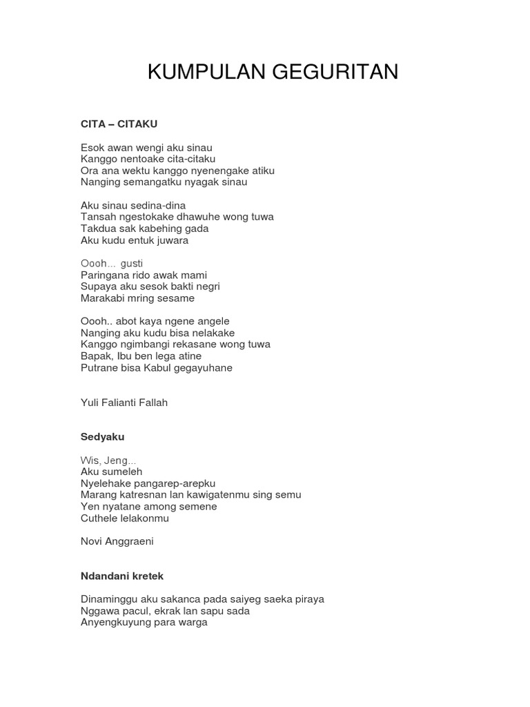 Contoh kedua yaitu mengenai contoh geguritan bahasa jawa tentang ibu. Sebagai contoh hari ibu yang setiap tahunnya kita peringati setiap tanggal 22. Melansir dari buku geguritan tradisional dalam sastra jawa, 2002 , geguritan adalah salah satu karya sastra jawa yang memiliki kata atau kalimat yang indah dan memiliki banyak makna dalam bahasa jawa. Di bawah ini ada kumpulan contoh geguritan bahasa jawa dengan berbagai macam tema yang bisa anda tembangkan atau bisa anda jadikan referensi dalam latihan menulis geguritan bahasa jawa. Contoh geguritan jawa tema ibu yellow jacke di dalam bahasa. Saka mletheking surya jumangkah suku kanthi tatag luaku ing sadawane dalan tumeka lingisire. Geguritan jawa tentang tema sekolahku. Pengaruh chairil anwar pada puisi malaysia suripan sadi hutomo. By fajar setiyoko posted on april 28, 2016.