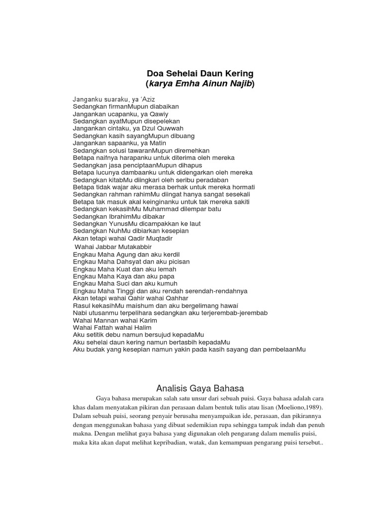 Janganku suaraku, ya 'aziz sedangkan firmanmupun diabaikan jangankan ucapanku, ya qawiy sedangkan ayatmupun disepelekan jangankan cintaku, ya dzul quwwah sedangkan kasih sayangmupun dibuang jangankan sapaanku, ya matin sedangkan solusi tawaranmupun diremehkan. Puisi merupakan sebuah karya sastra hasil dari ungkapan dan perasaan seseorang dengan bahasa yang terikat irama, matra, rima, penyusunan lirik, dan bait. Wahai mannan wahai karim wahai fattah wahai halim aku setitik debu namun bersujud kepadamu aku sehelai daun kering namun bertasbih kepadamu aku budak yang kesepian namun yakin pada kasih sayang dan pembelaanmu. Jangankan suaraku, ya ‘aziz sedangkan firmanmupun diabaikan. Doa sehelai daun kering puisi karya emha ainun nadjib. Banyak orang yang tertarik dengan puisi. Pertama, diksi yang digunakan bermakna kesendirian. Begitu engkau bersujud oleh : Janganku suaraku, ya ‘aziz sedangkan firmanmupun diabaikan jangankan ucapanku, ya qawiy sedangkan ayatmupun disepelekan jangankan cintaku, ya dzul quwwah sedangkan kasih sayangmupun dibuang jangankan sapaanku, ya matin sedangkan solusi tawaranmupun diremehkan