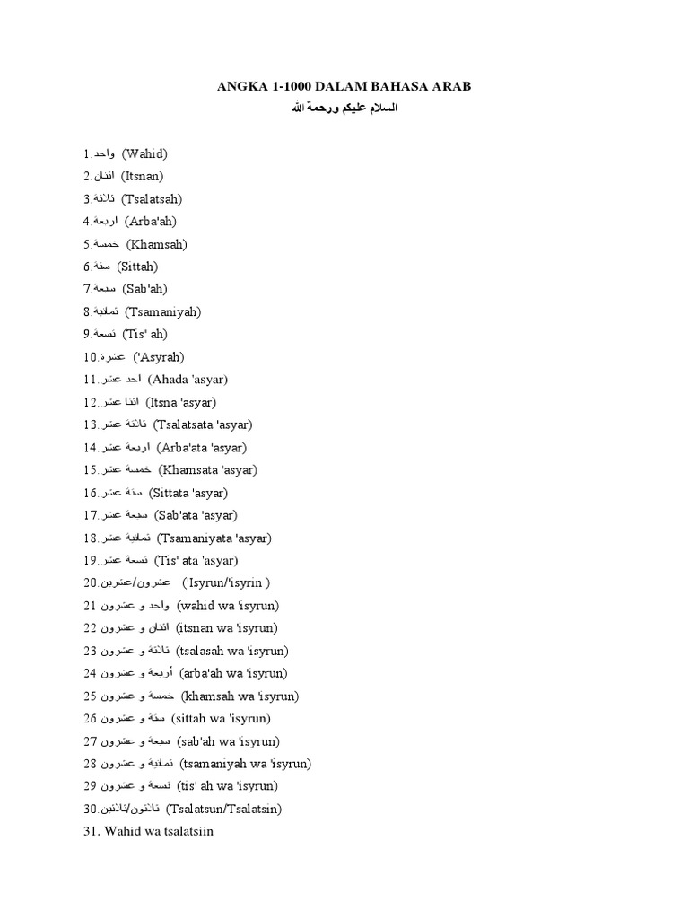 Penggunaan angka arab tersebar ke seluruh dunia melalui perdagangan, buku dan kolonialisme eropa. Angka arab 2019 dikonversi ke angka romawi: Angka rom dari 1 hingga 1000. Belajar menulis dan menghafal tentang ‘adad (bilangan), mulai dari angka 1 sampai 100 diawali dengan memperhatikan harokatnya dan tulisan latinnya. Angka 13 dalam bahasa, 1 100 nganggo bahasa jawa, 1 2 3 dalam bhs mandarin, 1 : Nombor bahasa inggeris dari 1 hingga 1000. Salah satunya adalah dengan cara mewarnai satu persatu. Total materi yang sudah selesai dikerjakan adalah 8 bab/pembahasan. 1 = ١ = واحد (wahid)