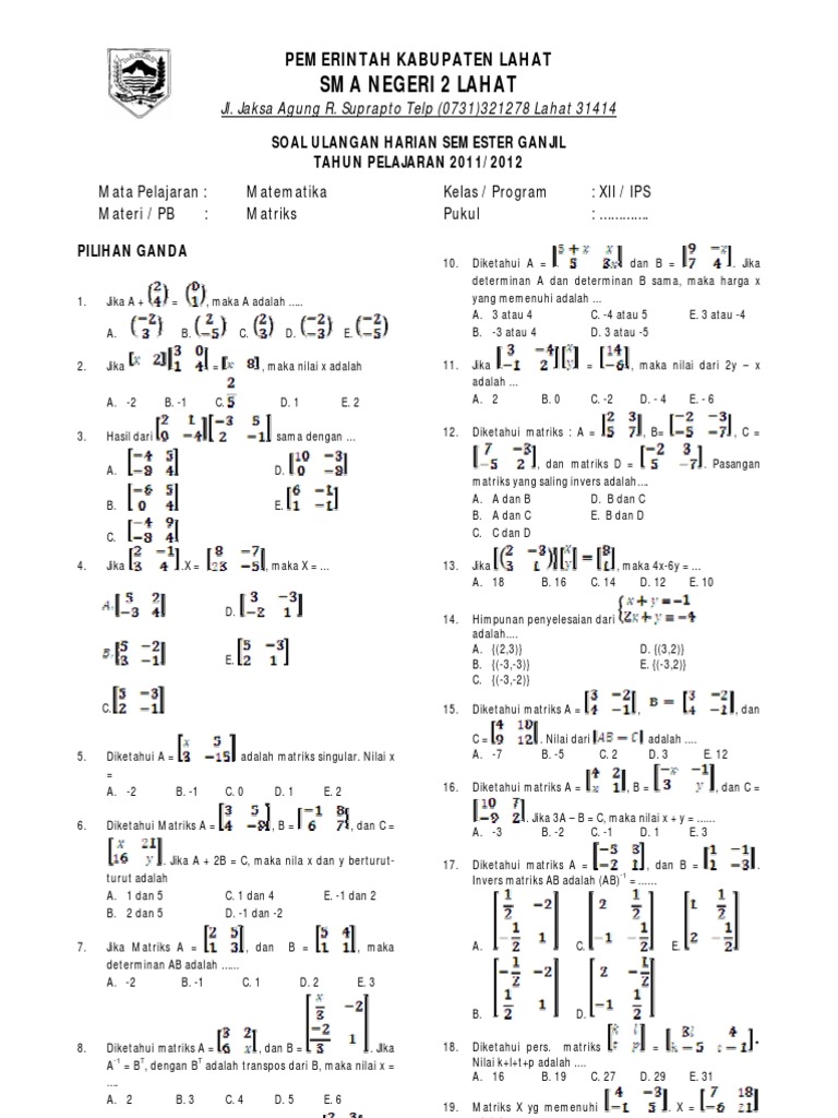 Jika a = dan b = adalah =…. Pembahasan kali ini merupakan soal matriks dari kelas 11 sma. Kumpulan foto dan gambar contoh soal terlengkap yang ada di internet. Dalam ilmu matematika matriks adalah susunan bilangan, simbol, atau ekspresi yang disusun dalam baris dan kolom sehingga membentuk suatu bangun persegi. 79% menganggap dokumen ini bermanfaat, tandai dokumen ini sebagai bermanfaat. Matriks operasi matriks rumus contoh soal matriks dan jawabannya lengkap dalam matematika matriks adalah susunan bilangan simbol atau ekspresi yang disusun dalam baris dan kolom sehingga membentuk suatu bangun persegi. Prediksi simulasi kisi kisi soal unbk sma ma ma smk dan mak tahun ajaran 20192020 contoh soal un lengkap dengan kunci jawaban. Dimana matriks sendiri merupakan penggambaran hasil transformasi fungsi linear dalam bentuk baris dan kolom yang tersusun atas angka atau objek lainya. Semoga artikel ini bermanfaat untuk kita semua.